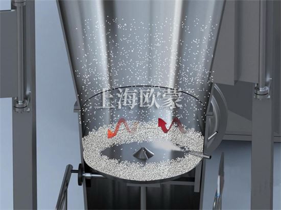 空氣經(jīng)加熱凈化后,由引風(fēng)機從下部導(dǎo)入,穿過料斗的孔網(wǎng)板。在工作室內(nèi),經(jīng)攪拌和負壓作用形成流態(tài)化,水份快速蒸發(fā)后隨著排氣帶走,物料快速干燥。